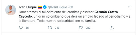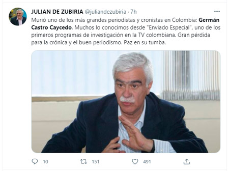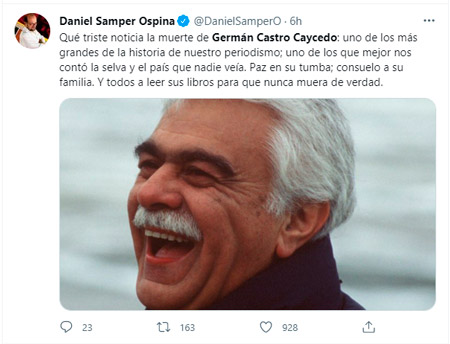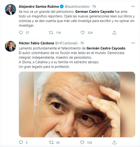 El periodismo y la literatura colombiana está de luto por la muerte del periodista y escritor colombiano Germán Castro Caycedo, Oriundo de Zipaquirá (Cundinamarca), quien a sus 81 años sufría una dolorosa enfermedad.