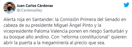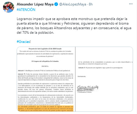 "Logramos impedir que se aprobara este monstruo que pretendía dejar la puerta abierta a que mineras y petroleras, siguieran depredando el bioma de páramo, los bosques Altoandinos adyacentes y en consecuencia, el agua del 70% de la población", concluyó el Senador Alexánder López Maya.